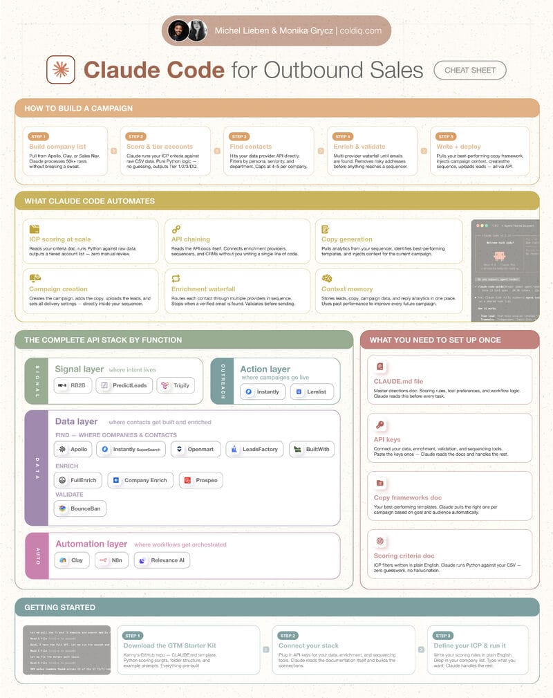 Claude Code is a game-changer for cold email campaigns. Imagine cutting hours of manual work down to minutes. With smart APIs like Apollo.io, PredictLeads, and Instantly.ai, you can build, score, enrich, and launch targeted outreach without leaving your workspace.